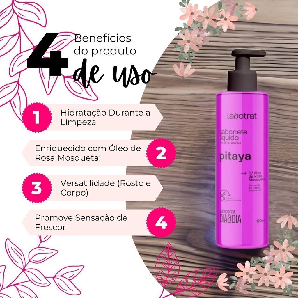O Sabonete Liquido Pitaya Labotrat e enriquecido com extrato da fruta e possui propriedades antioxidantes que ajudam a manter a pele jovem e saudavel. Ele limpa profundamente, removendo impurezas e residuos de poluicao, deixando a pele revitalizada, macia e com uma fragrancia exotica e vibrante.